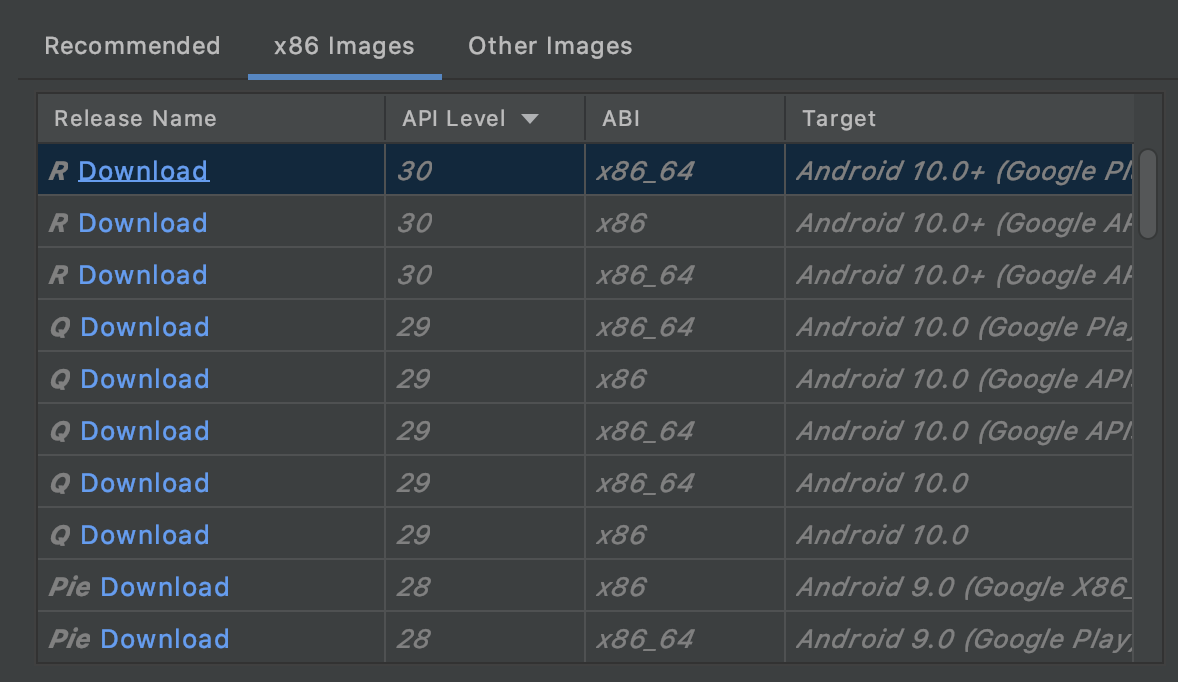 25.3.0 이전의 에뮬레이터 버전은 Android SDK 도구의 일부로 배포되었습니다. 최신 버전이 있는지 확인하려면 SDK Manager에서 업데이트를 확인하세요. 이 업데이트에는 Android 11(API 수준 30) 시스템 이��