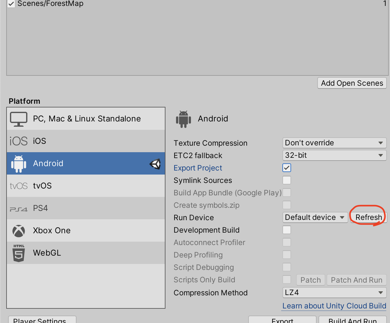 유니티 빌드 세팅에서 Run Device 옆쪽에 보면 Refresh 새로고침 버튼을 눌러준다.