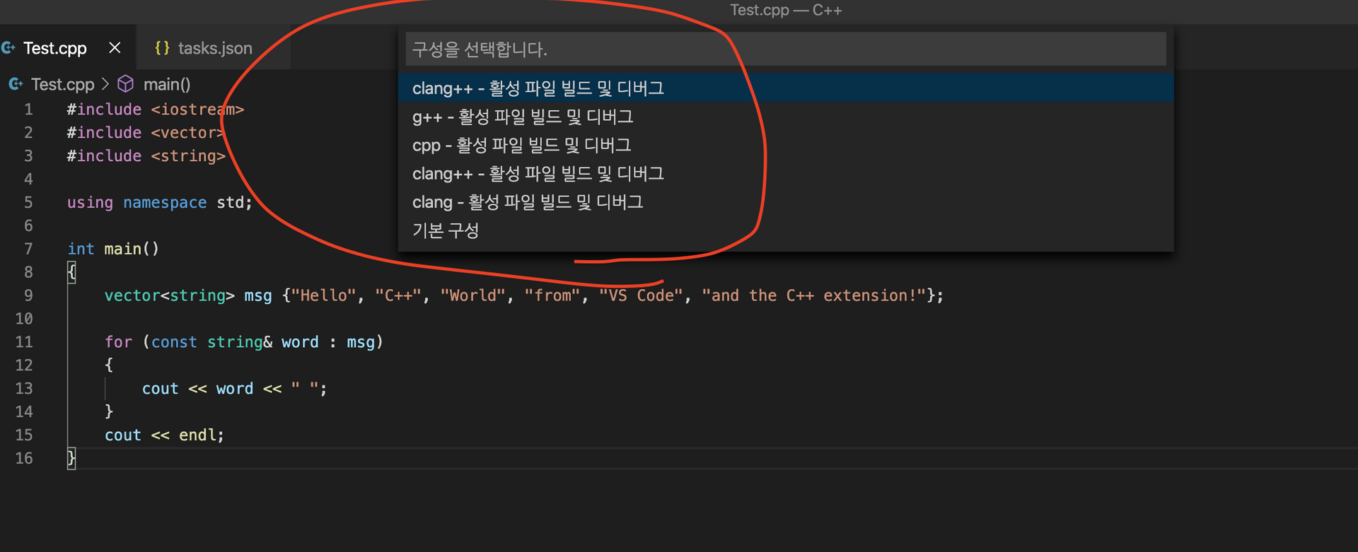C/C++ clang++ build active file을 선택한다.