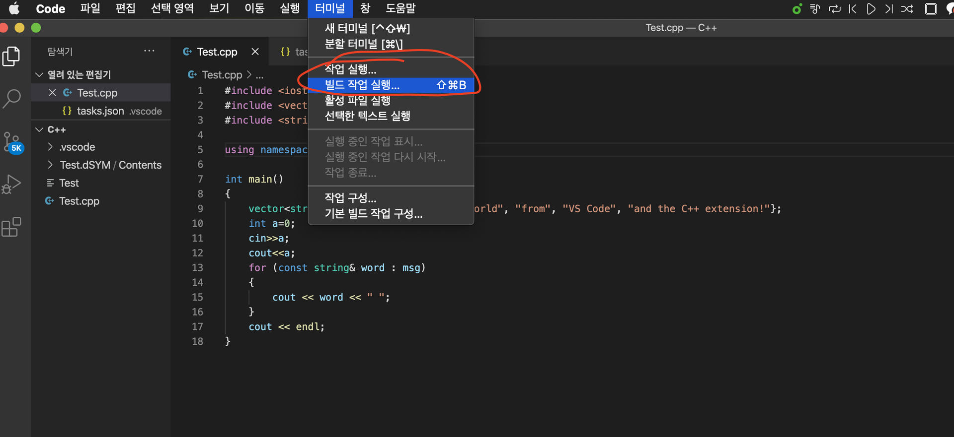 그다음 돌아와서 Terminal → Run Build Task. 를 누른다.