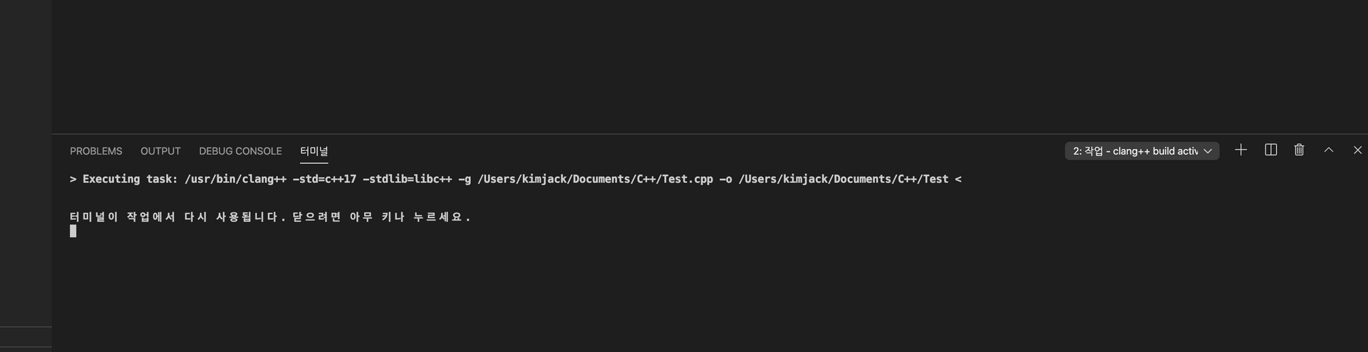 빌드 Task가 실행되면 코드 창 아래 터미널 윈도우가 나타난다.
