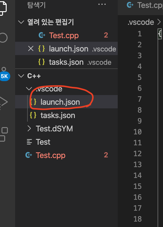 clang++ 활성 파일 빌드 및 디버그를 선택하고 나면 워크스페이스 경로에 launch.json 파일이 생성되었다.