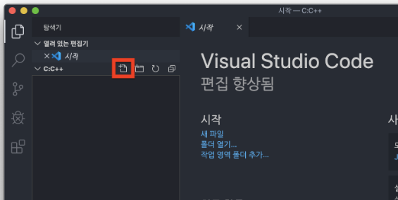위에 빨간색 네모가 쳐진 버튼을 누르면 파일 생성이 가능하다 확장자를. cpp로 만들면 자동으로 c++ 파일로 생성된다.