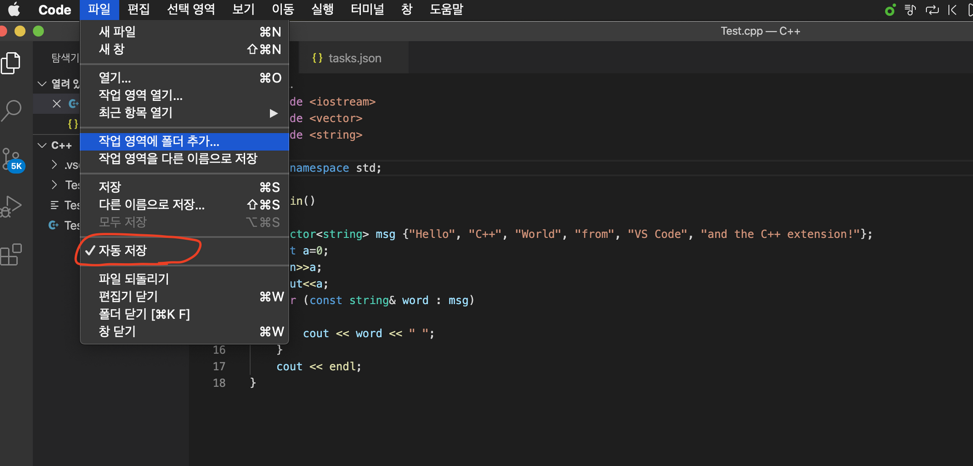 나는 이름을 Test.cpp 로 만들었다.