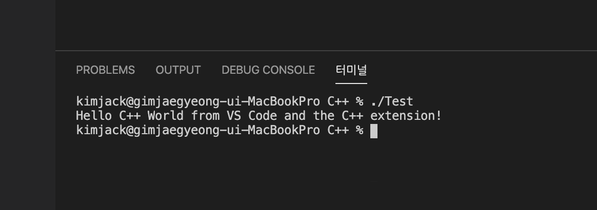 이 실행파일을 VSCode에서 실행시키려면 터미널에 ./Test (본인 코드이름)라고 입력한다.