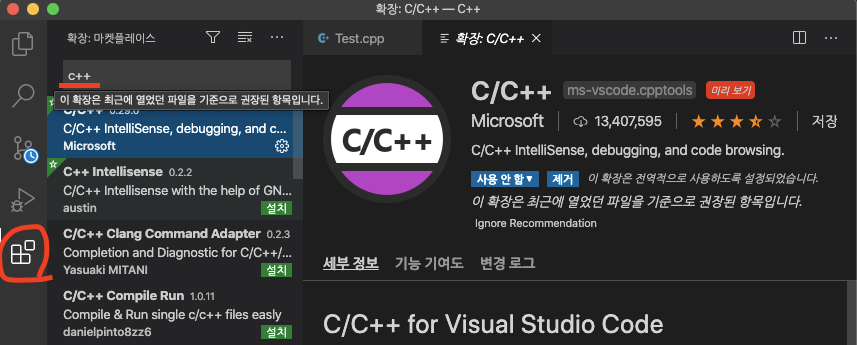 Visual Studio Code에서 C++ 을 쓰기 위해서는 제공하는 extension을 설치해야 한다.