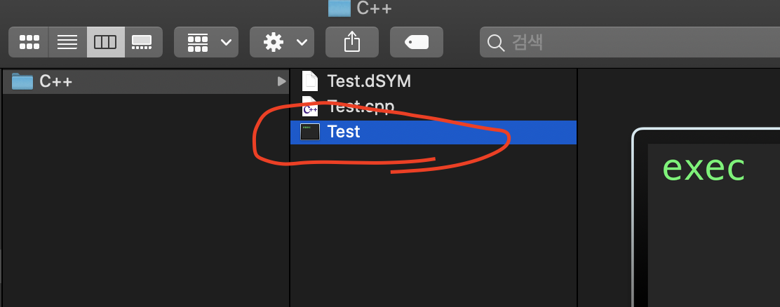 그리고 Finder에 가보면 워크스페이스 경로에 다음처럼 빌드된 실행파일이 나타난다.